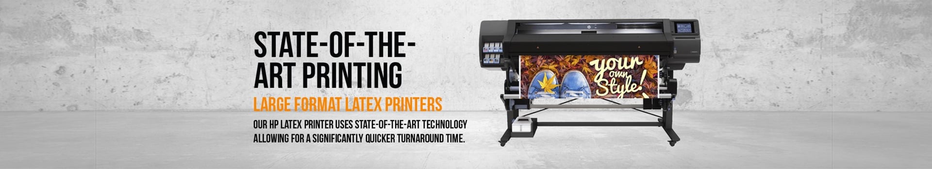 Our large format printers use state-of-the-art latex printing technology. This allows for a speed three times faster than solvent printers, and with no out-gassing, our turnaround time is within days, not weeks.